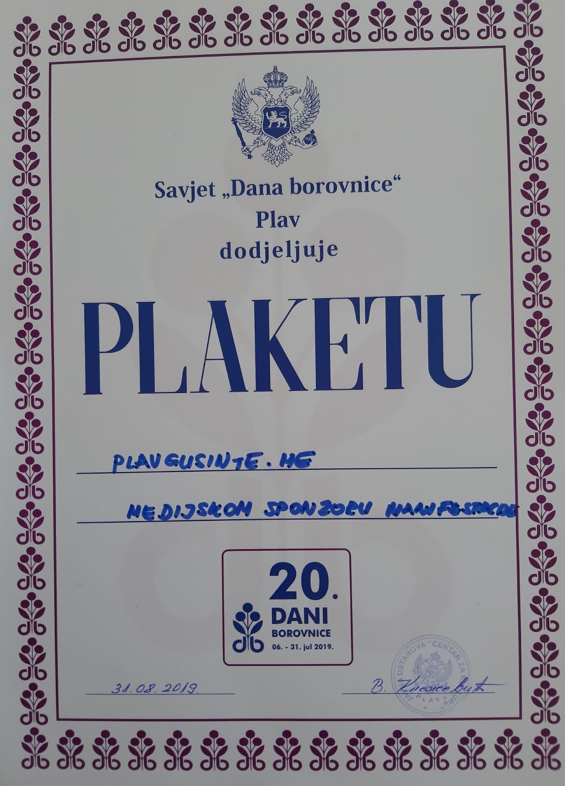 PLAV- Danas je u ime Savjeta manifestacije „Dana borovnice“ direktor Doma kulture „Husein Bašić“ Vladimir Knežević uručio plaketu portalu www.plavgusinje.me.