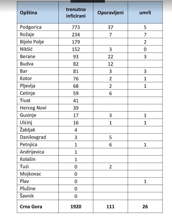 U Crnoj Gori danas je registrovano 98 novih slučajeva obolijevanja od koronavirusa. Oporavilo se još 39 osoba, dobra vijest je da preminulih u prethodna 24 sata nije bilo. Ukupan broj aktivnih slučajeva COVID19 je 1920, a na sto hiljada stanovnika broj trenutno oboljelih je 305.