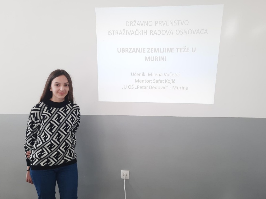 PLAV-U konkurenciji 186 učenika, Milena Vučetić je 22.05.2021. godine, osvojila treće mjesto na “Državnom prvenstvu istraživačkih radova” DPIOS2021 -Medjunarodni nivo i na taj način najbolje predstavila OŠ “Petar Dedović” u Murini, Opštinu Plav i državu Crnu Goru.
